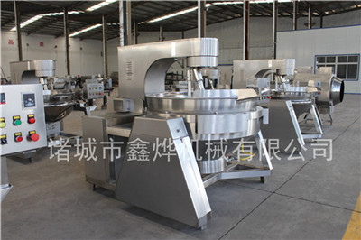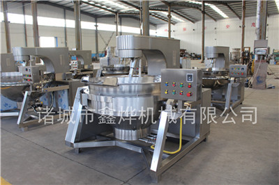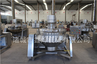 本設備有四頭攪拌、五頭攪拌和七頭攪拌,根據炒鍋容積和物料性質來決定攪拌頭的數量。無需人工翻炒,鍋體液壓傾斜高位自動出料,設備有專門的進料料斗,可以裝配乳化器。