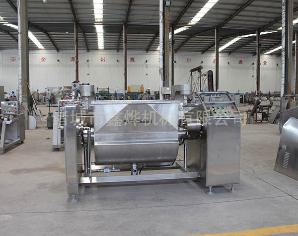 本機的U形鍋頂部抽真空,夾套采用蒸汽加熱,無段變速與蝸輪,減速機的組合傳動,增大了橫軸攪拌的力矩,采用食品級材質材質刮板的攪拌器,在物料的翻滾攪拌過程中,攪拌器與鍋體的充分接觸,確保了無攪拌死角。鍋體的開蓋,卸料,復位采用液壓,機械傳動控制,操作方便。真空炒制可降低炒制溫度,特別適應于高粘度材料的炒制,避免了因過度受熱引起色澤及口味的變化,保持了物料原有的色香味。提高了炒制效率,并降低能耗,縮短了炒制時間。